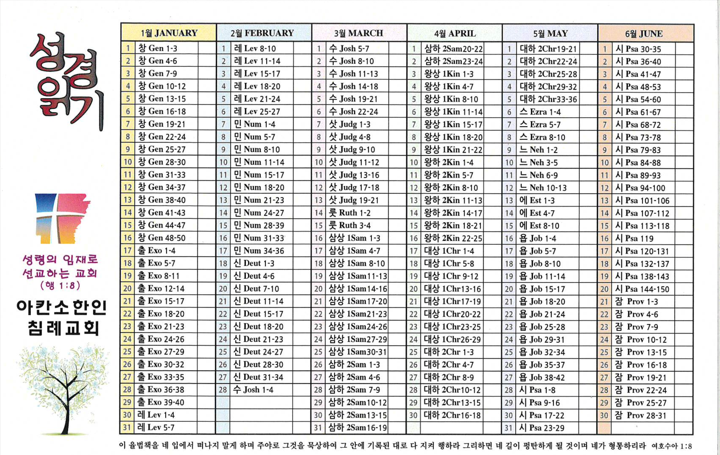 아칸소 한인 침례교회에서는 여러분이 1년 안에 성경을 완독할 수 있도록 돕는 특별한 성경 읽기 계획표를 준비했습니다.