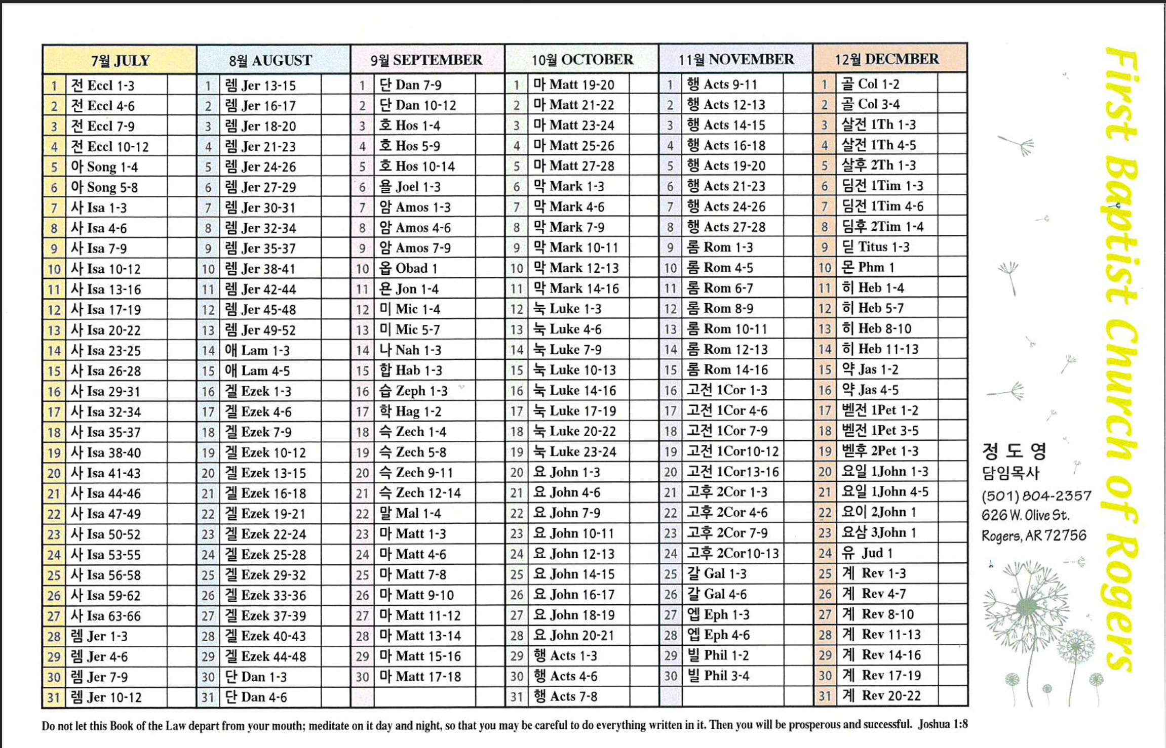 아칸소 한인 침례교회에서는 여러분이 1년 안에 성경을 완독할 수 있도록 돕는 특별한 성경 읽기 계획표를 준비했습니다.