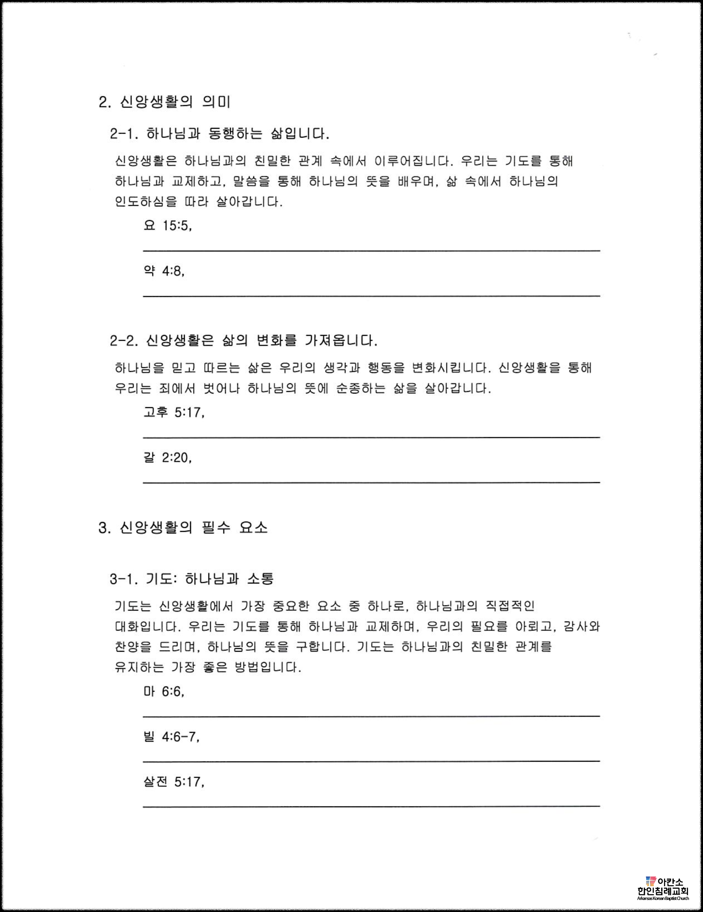 - 신앙생활은 교회에 출석하는 것으로만 끝나는 것이 아니라, 삶 전체에서 하나님과 함께하는 것.